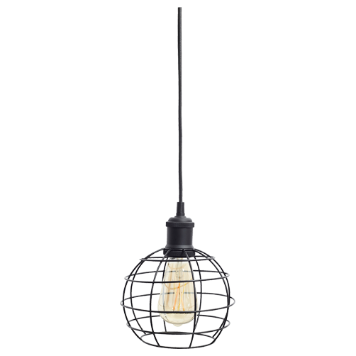 Single decorative Bird Cage shaped pendant in Matt Black, fully adjustable 2m fabric cable, with 6.5Watt ES ST64 LED Amber Filament Smart Lamp, controlled via the WiZ app & voice controlled smart devices: Hey Google, Alexa, Siri, Samsung SmartThings. LED lifespan L70 at 15,000 hours.